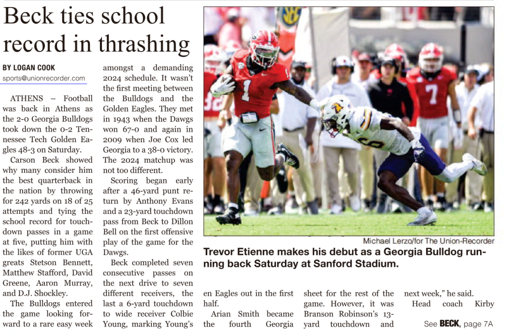 Football is back in Athens as the 2-0 Georgia Bulldogs took down the 0-2 Tennessee Tech Golden Eagles 48-3 on Saturday. Carson Beck showed why many consider him the best quarterback in the nation by throwing for 242 yards on 18 of 25 attempts and tying the school record for touchdown passes in a game at five, putting him with the likes of former UGA greats Stetson Bennett, Matthew Stafford, David Greene, Aaron Murray, D.J. Shockley, and Joe Cox.