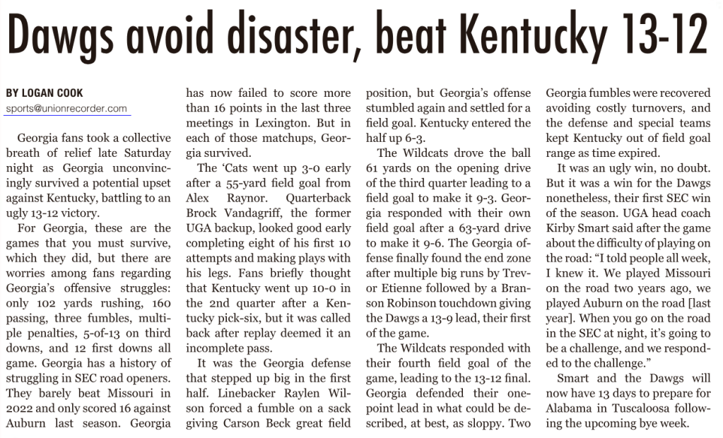 For Georgia, these are the games that you must survive, which they did, but there are worries among fans regarding Georgia’s offensive struggles: only 102 yards rushing, 160 passing, three fumbles, multiple penalties, 5-13 on third downs, and 12 first downs all game. Georgia has a history of struggling in SEC road openers. They barely beat Missouri in 2022 and only scored 16 against Auburn last season. Georgia has now failed to score more than 16 points in the last three meetings in Lexington. But in each of those matchups, Georgia survived.