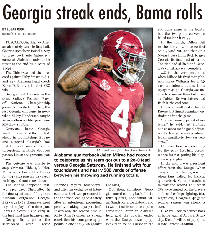 Everyone knew Georgia would have a difficult task ahead of them in this matchup. But no one expected this bad of a performance from Georgia in the first half. Two interceptions, multiple dropped passes, blown assignments, you name it. The defense was unable to stop Milroe as he torched the Dawgs for 374 yards passing, 117 yard rushing, and four touchdowns.