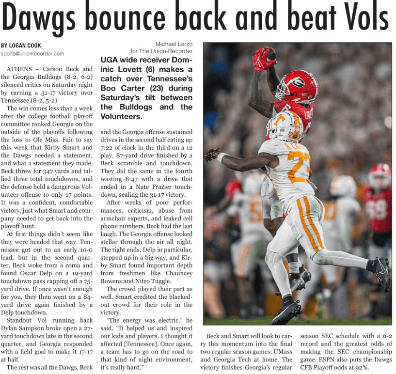 The win comes less than a week after the CFB playoff committee ranked Georgia on the outside of the playoffs following the loss to Ole Miss. Fair to say this week that Kirby Smart and the Dawgs needed a statement, and what a statement they made. Carson Beck threw for 347 yards and tallied three total touchdowns, and the defense held a dangerous Volunteer offense to only 17 points. It was a confident, comfortable victory, just what Kirby Smart needed to get back into the playoff hunt.