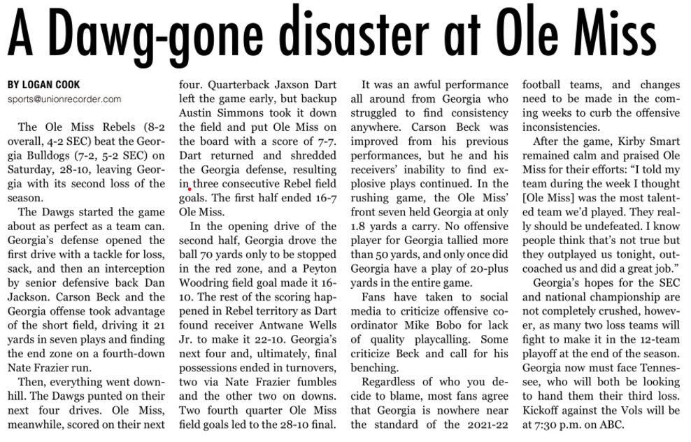 In the opening drive of the second half, Georgia drove the ball 70 yards only to be stopped in the red zone, and a Peyton Woodring field goal made it 16-10. The rest of the scoring happened in Rebel territory as Dart found receiver Antwane Wells Jr. to make it 22-10. Georgia’s next four and, ultimately, final possessions ended in turnovers, two via Nate Frazier fumbles and the other two on downs. Two fourth quarter Ole Miss field goals led to the 28-10 final.