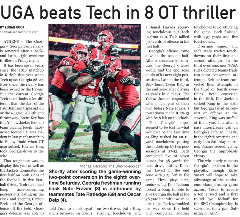 Overtime came, and each team traded touchdowns on their first and second attempts. In the third overtime, new NCAA rules dictated teams trade 2-pt conversion attempts. Neither team converted their attempts in the 3rd or 4th overtime. Both converted in the 5th. Dan Jackson sacked King in the 6th but Georgia failed to convert on offense. In the 7th, Kaynes King was stuffed at the 1-yard line after a pass interference call on Georgia’s defense. Finally, in the 8th overtime and early into Saturday morning, Nate Frazier scored, giving Georgia the improbable victory.