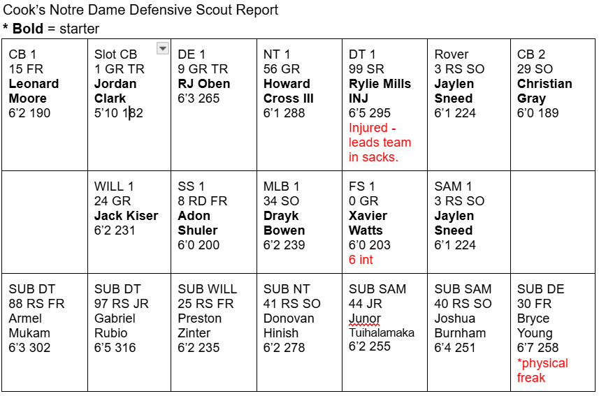 Notre Dame will be without their sack leader in defensive tackle Rylie Mills. Replacing him will be a mix of RD FR Armel Mukam and RS JR Gabriel Rubio. Outside linebacker Jack Kiser anchors the linebacker unit and leads the team in tackles for the season. Middle linebacker Drayk Bowen is a hard nose, downhill, run-stopping force as well. In the secondary, Notre Dame has been without their star cornerback Benjamin Morrison since a season ending injury in October, but safety Xavier Watts leads the team in interceptions with 6, and Leonard Moore is a true lockdown corner. True freshman and athletic freak Bryce Young will play a lot of downs as well, and he could easily be an x-factor in the turnover game with his freakishly long wingspan. Young is the only 5* HS prospect on Notre Dame’s roster (for whatever that is worth). Xavier Watts anchors the secondary as the senior leader and leader in interceptions