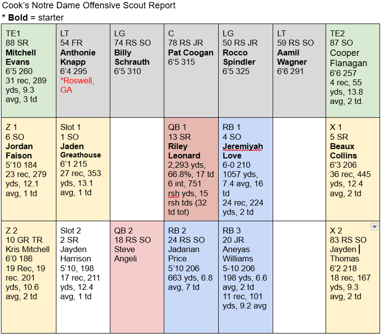 Leonard has weapons at his disposal, too. The Irish have three running backs that average over 7 yards a carry. Jordan Fiason is a playmaker on the outside and on special teams. At 6’3, Beaux Collins will win one-on-ones. Tight end Mitchell Evans has sure hands as well.